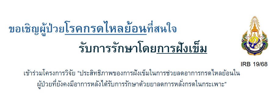 เข้าร่วมโครงการวิจัย "ประสิทธิภาพของการฝังเข็มในการช่วยลดอาการกรดไหลย้อนในผู้ป่วยที่ยังคงมีอาการหลังได้รับการรักษาด้วยยาลดการหลั่งกรดในกระเพาะ"