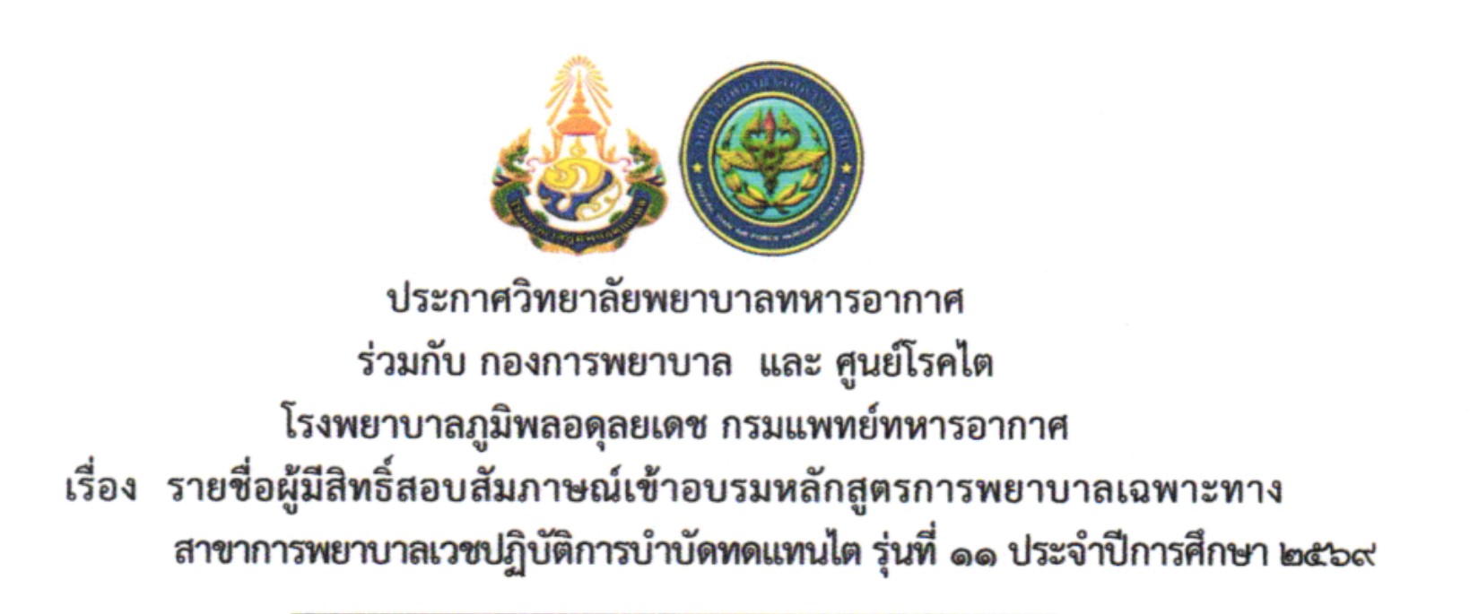 รายชื่อผู้มีสิทธิ์สอบสัมภาษณ์เข้าอบรมหลักสูตรการพยาบาลเฉพาะทาง สาขาการพยาบาลเวชปฏิบัติการบำบัดทดแทนไต รุ่นที่ 11 ปี 69 (24/3/2026)